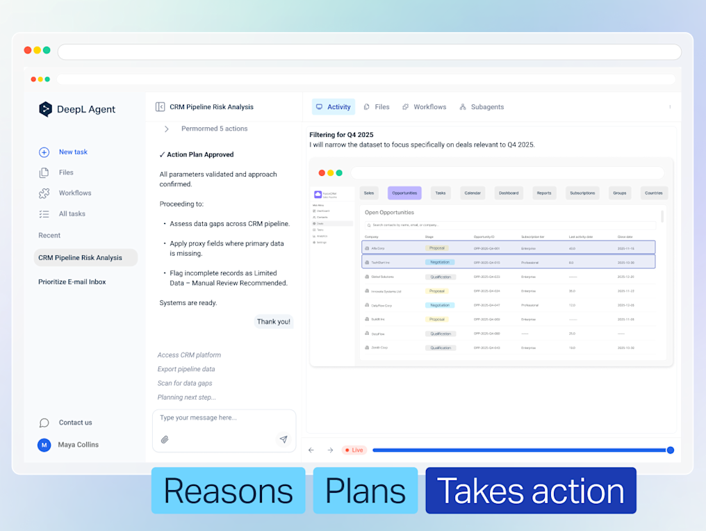 DeepL Agent is so much more than a chat interface. It uses a computer browser like you would to plan and complete tasks on your behalf, like navigating websites, access internal systems, filling forms and much more.